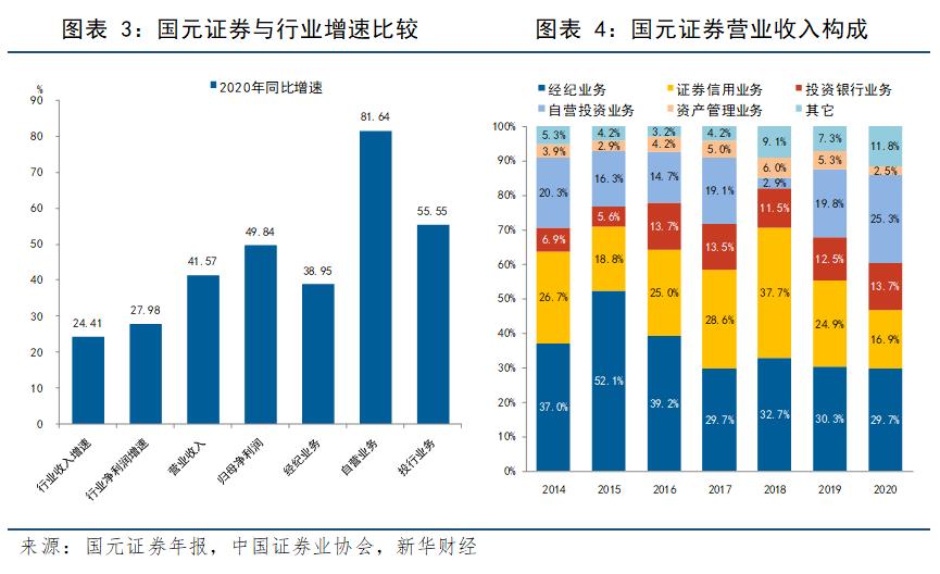 2020年,国元证券业务表现靓丽,主要表现为:一是营业收入、利润均同比大幅提升,且业绩增长速度明显快于行业水平,同时成本支出合理,风险管理能力提升。二是投行业务保持优势地位,收入增长55.55%,全年完成项目53个、募集资金333亿元,再创历史新高。三是自营业务实现固收权益“分而治之”,投资规模和效益持续提升,收入高增81.64%。四是经纪业务在财富管理转型推动下实现质效提升,收入增长38.95%,利润高增207.08%。五是ESG纳入公司治理,建立三级治理体系,同时强化环境保护、社会责任担当。六是提出打造一流现代投行的“十四五”战略目标,推动资产规模、营业收入及行业地位大幅提升。
