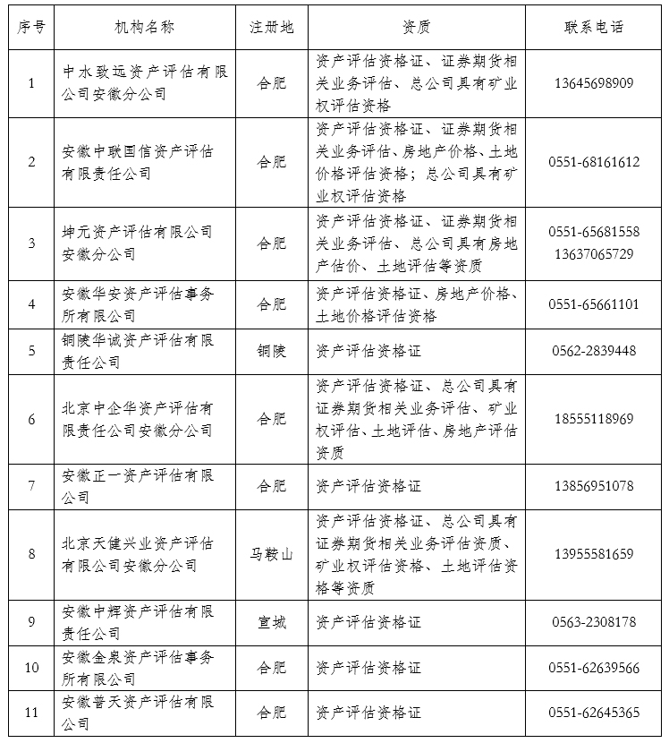 根据《安徽省企业国有资产评估管理暂行办法》(皖国资产权函[2018]47号)及《关于省属企业选聘评估机构备选库有关事项的通知》(皖国资产权函[2018]216号)等相关规定要求,本着公开、公平、公正原则,选择11家资产评估机构,建立国元集团资产评估机构备选库。现公告如下: